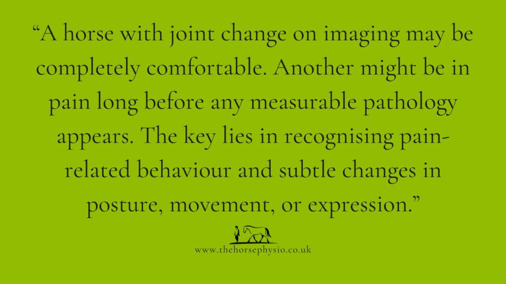 Even when early osteoarthritis is detected, what does that mean for the horse’s comfort, or for performance? In people, osteoarthritis doesn’t always cause pain, limit daily life, or affect sporting ability. So perhaps, alongside studying molecules, we also need to keep studying behaviour — the language our horses use to tell us how they feel.